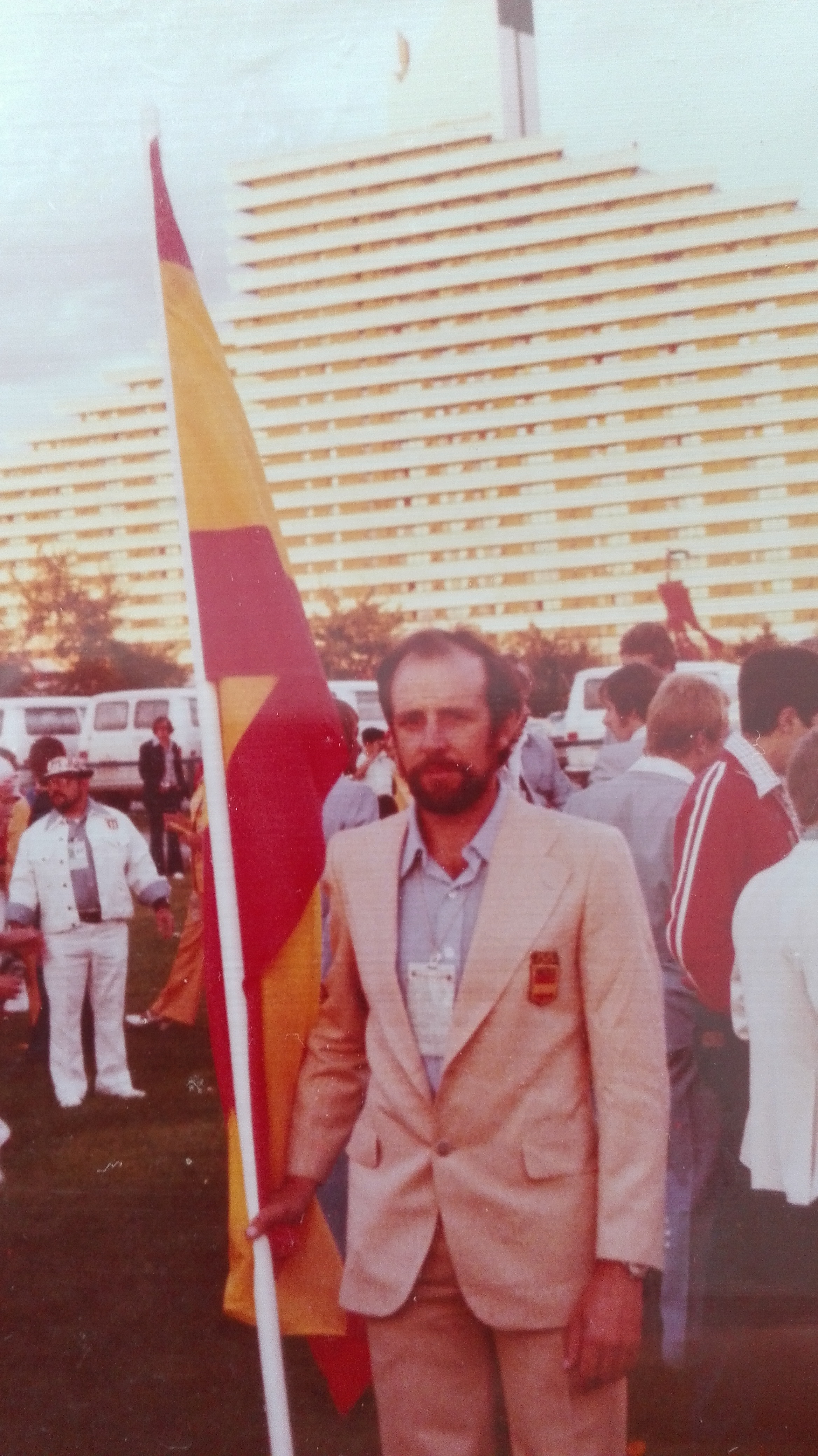 Amando Prendes Viña en la Villa Olímpica de Montreal 1976, antes del desfile inaugural.